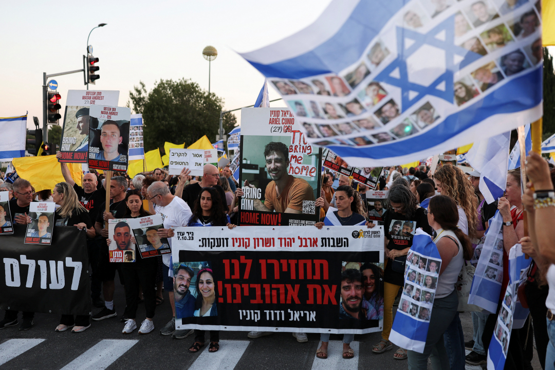 Avvarðandi hjá teimum, sum eru gíslar í Gasa, gingu aftur mótmælisgongu í Jerusalem í gjárkvøldið. (Mynd: Ronen Zvulun/Reuters/Ritzau Scanpix)